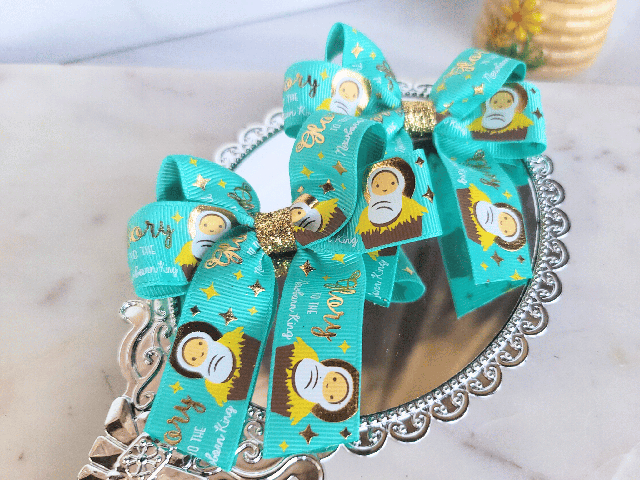 Sing glory to the Newborn King. Herald the true reason for the season with our Baby Jesus Nativity Pigtail Bows! This meaningful set of boutique hair bows features the tender image of a baby in the manger on soft mint grosgrain ribbon, finished with a gold glitter center. Crafted with intention to honor the sacred story of Christmas, these bows bring reverence and Everyday Elegance to every holiday hairstyle for girls.