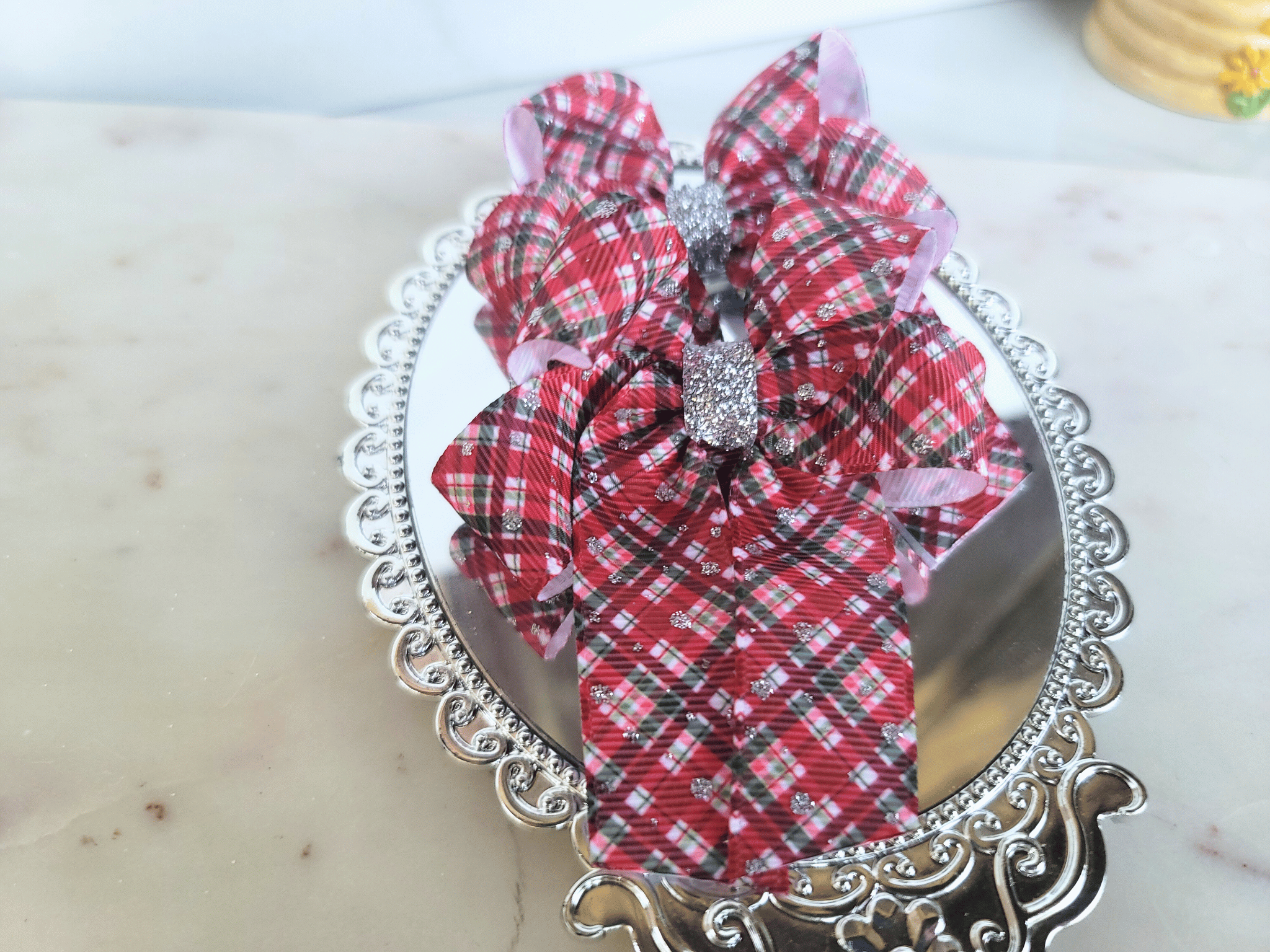 Handmade red and green Christmas plaid pigtail bows with sparkly glitter accents and silver glitter center. Premium grosgrain for festive holiday style.