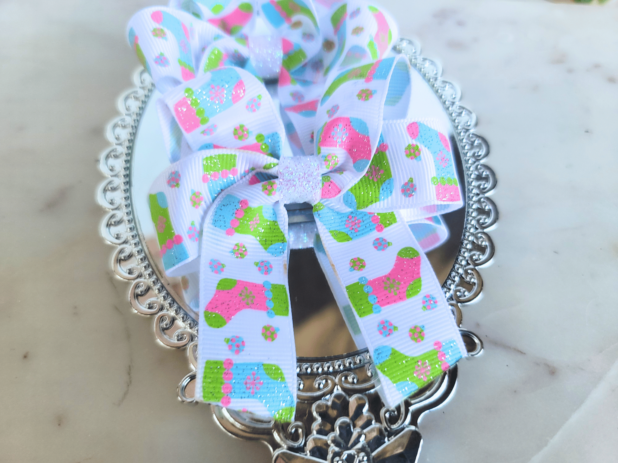 Handmade white pigtail bows with pink, blue, and green Christmas stockings and iridescent white glitter center. Premium grosgrain for nostalgic holiday style.