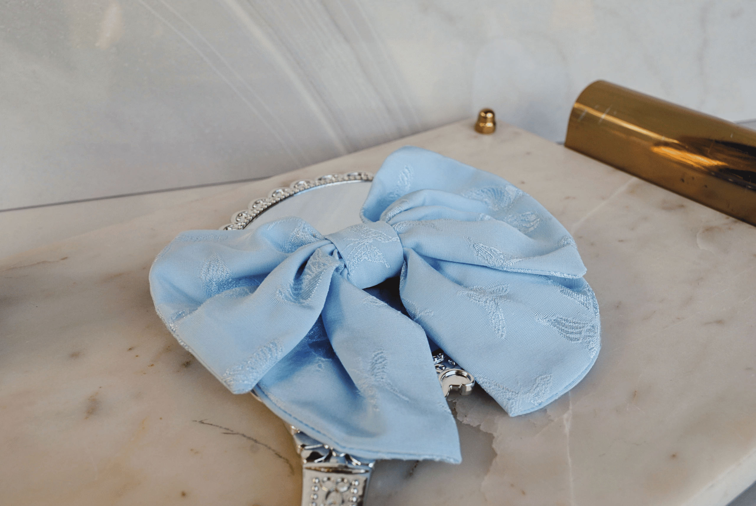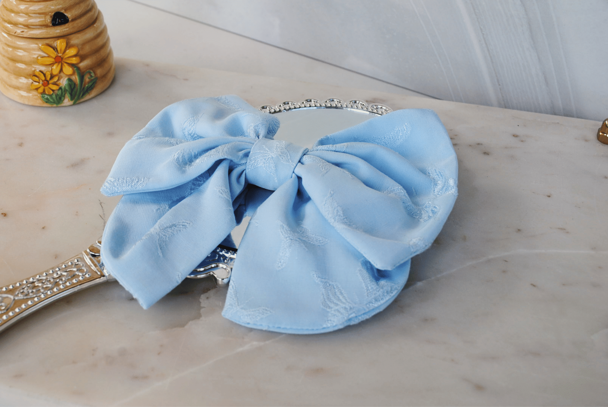 This silky bow is pastel blue with satin embossed butterflies and is large, measuring approximately 6″ x 6″ and is handmade with love.