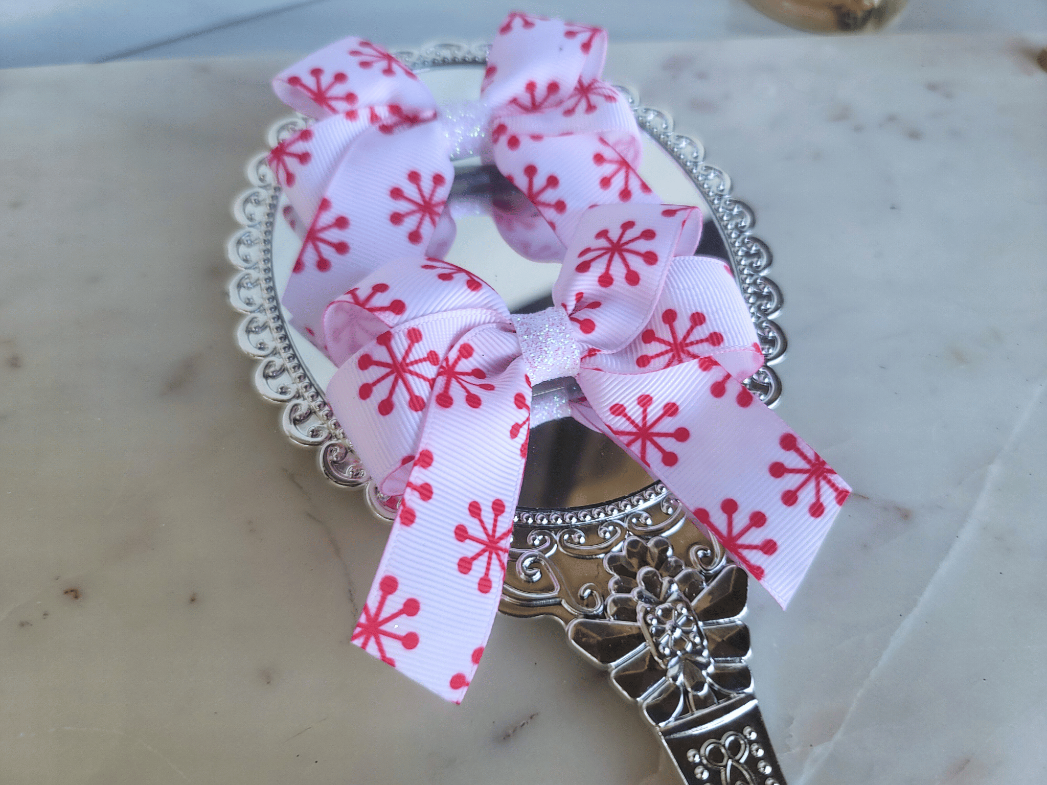 Add a touch of sparkle to those dull winter days with these cheery Christmas pigtail bows which feature a whimsical red snowflake pattern on crisp white ribbon.
