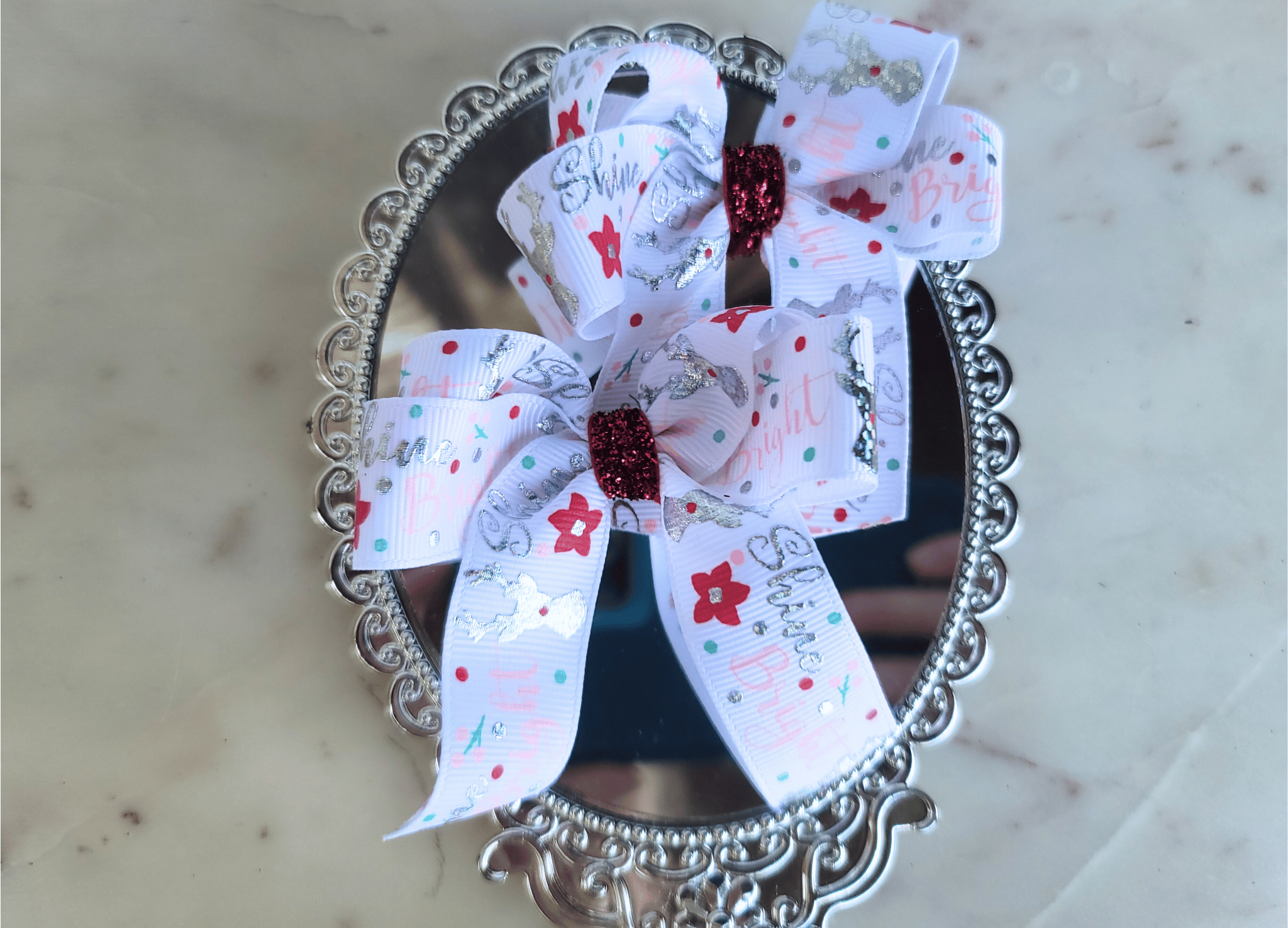 Handmade white pigtail bows with silver foil reindeer and red glitter center. Premium grosgrain for elegant winter style. Perfect for holiday celebrations.