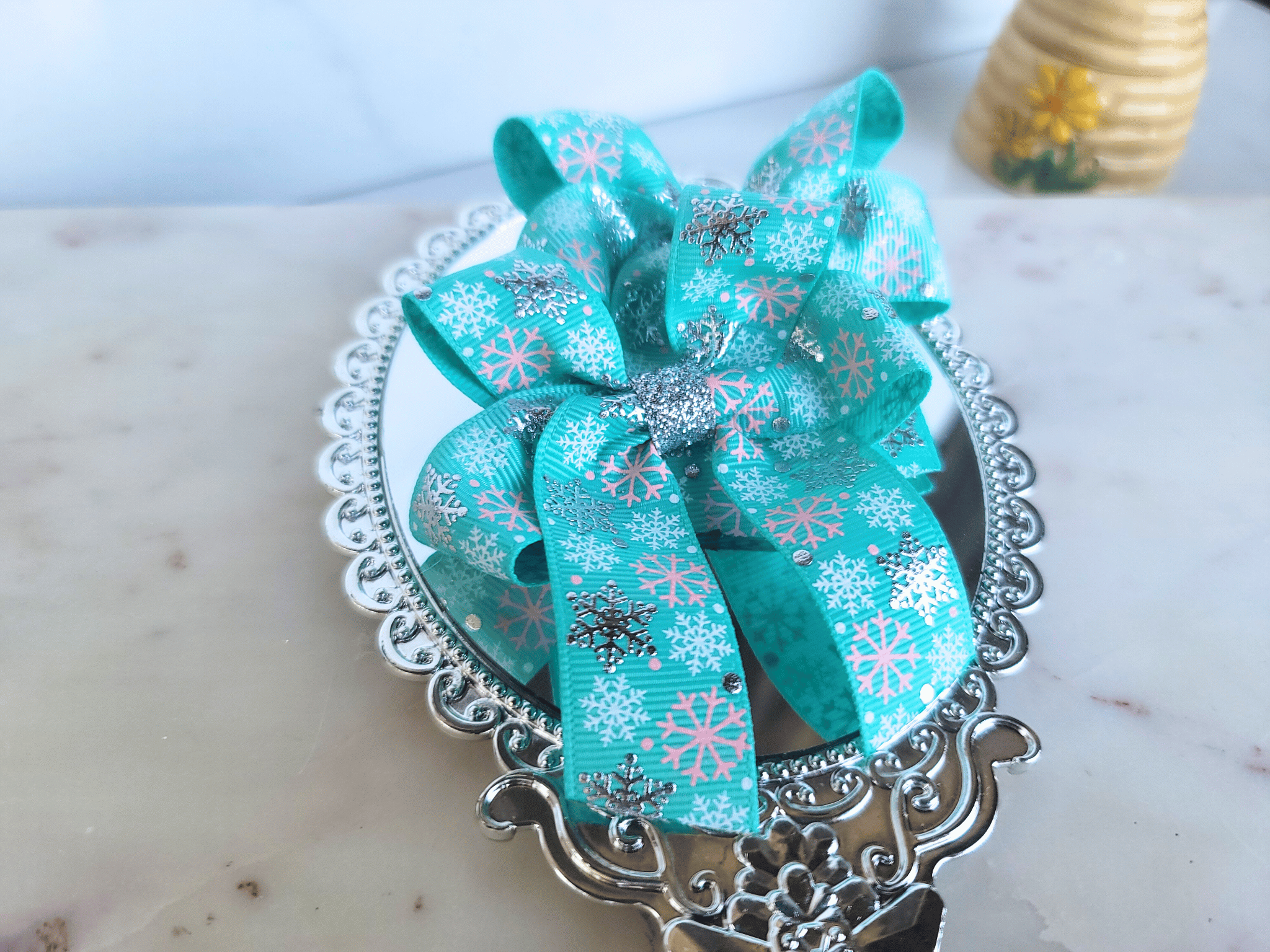 Handmade aqua blue pigtail bows with pink, white, and silver foil snowflakes and silver glitter center. Premium grosgrain for winter elegance.